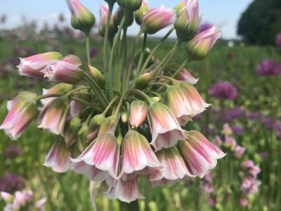 We have put a very nice variety in the spotlight this week: the Allium (nectaroscordum) Tripedale 'Rosy Bells'. It took 30 years before Wietse could actually bring this special variety to the market due to the difficult propagation. For example, a large part of the bulbs have already been lost, because in 2012 it froze much harder than usual during a couple of weeks than in normal Dutch winters. It turned out to be too much. It is also very difficult to germinate seeds of this allium. But Wietse persevered and now he knows how to handle this particular variety.