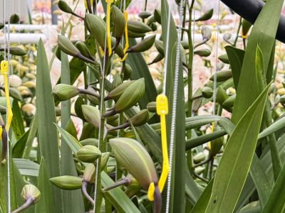 Cymbidiums only bloom once a year, making their cultivation both delicate and unique. Flowering takes place in the colder months. Even during the recovery period after harvest, the plants remain in cool conditions, allowing them to store energy and sugars in their bulbs. In the warmer months, the plant begins to grow again, producing new leaves for the following season. Every part of the process is done by hand – from tying the first buds, to harvesting and sorting. On average, a plant is harvested for eight years at Koningshof, though some varieties continue producing well beyond that.
