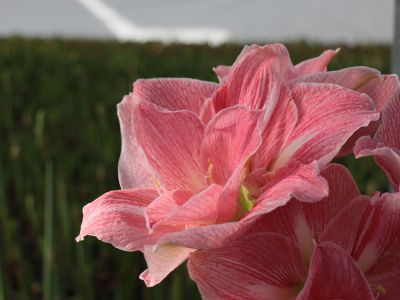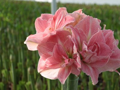 A very large heavy salmon-pink, double-flowered Amaryllis. Amazone has three beds of this beautiful variety. The Lovely Nymph is unique because of its extremely heavy quality. She has huge stems, big heads and lots of flowers. In addition, she has a high production rate and she is very easy to grow. A hugely valued product for the grower as well as for the consumer.