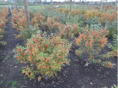 An adult plant focuses on growth the first year. The shrub produces branches that give berries the following year. In the "berry year", the bushes receive a special treatment in January / February. With a spade (some growers do this by machine), the roots that grow outside the root ball are cut loose. As a result, the side branches of the shrubs stay shorter and the flowers grow much closer together, creating beautiful compact branches with a lot of berries. The loosely cut root ball can extract much less water from the ground, which means that a lot of irrigation has to be done. Plenty of water also ensures beautiful full berries.