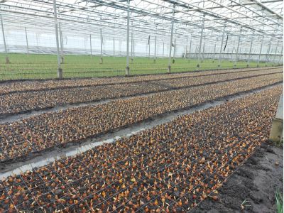 The bulbs are grown at a bulb grower. This is a two-year process. Each "mother bulb" produces two baby bulbs, called tangles. These tangles go back into the ground to continue growing for another year, the mother bulb is sold to the growers who force the flowers.