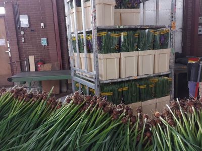 The harvested flowers are stripped of their bulbs in the shed, then selected for ripeness and bunched.