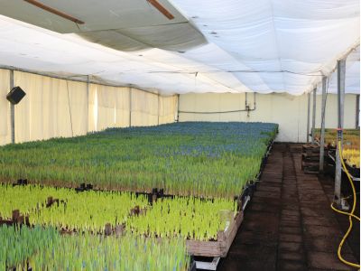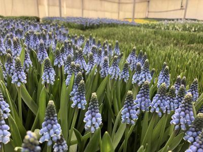 Before a Muscari flower can be grown in the greenhouse, the bulbs must be large enough. Small bulbs are first grown outside. The bulbs only make leaves outside allowing them to grow. By planting these bulbs every year, they eventually grow big enough to give a beautiful flower. Most of these bulbs are used for so-called 'dry sales', which is the garden trade. Only 10% is used for cut Muscari cultivation.