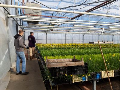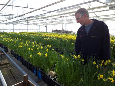 Hans runs the company together with his wife and an employee. He grows about 300,000 stems of daffodils every season, divided in the weeks from mid-January to Easter. The species can vary per year but the numbers are about the same.