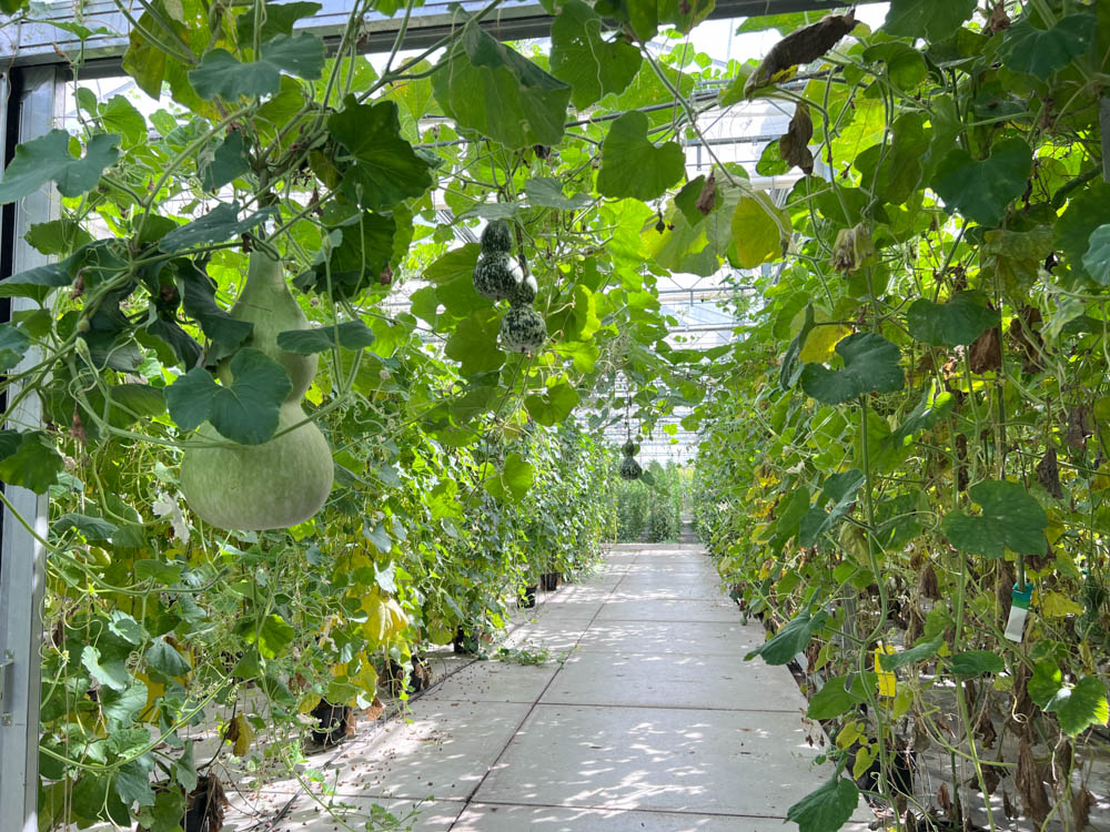 Cultivation takes place entirely in the greenhouse. All plants are trained upwards along strings so the fruits can hang freely and develop without damage. Both the fruit-bearing crops and the climbing types such as diplocyclos are carefully tied.
