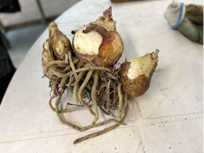 The leaf remains on the plant for as long as possible because the bulb draws energy from it to grow. About three months before the new bloom, the leaf is removed so that all energy goes to the flower. After four seasons, the bulbs are harvested, the roots removed, and the soil steamed. The bulbs are then cooked and prepared to be replanted.