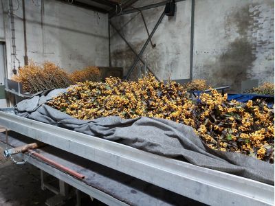 Ilex is sold with no leaves on the branches. After all, the ornamental value lies with the berry. The moisture evaporates quickly from the leaf, after which the leaf draws moisture from the berry. This is at the expense of the shelf life of the product. The leaves are removed by scalding. The branches are placed on tables covered with black plastic and bubble wrap, creating a very warm and humid environment. After ten days the leaves fall off and the product can be processed.