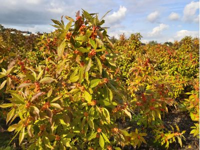 Emiel de Jong is known for his versatile assortment consisting of many colors of Ilex. On 14 hectares he grows seven varieties of Ilex verticillata every season. Because of the wide variety of Ilex colors, the Ilex's Christmas image is slowly disappearing and Ilex is becoming an increasingly appreciated autumnal item. Three years after our first visit, we are again welcomed by Emiel. It is the start of a new season and full of enthusiasm Emiel showed us around on his field.