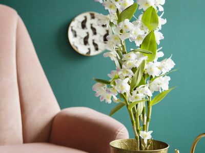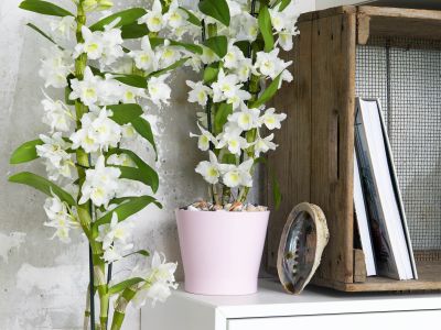 The most famous Dendrobium nobilé species is the Dendrobium nobilé "Apollon". This beautiful white orchid fits into any interior and also has a good shelf life. A plant with two branches can hold more than 50 flowers. Her bamboo-like appearance makes her even more suitable for the modern "urban jungle" style. She is graceful, exclusive, full of flour and also smells really nice; a playful, vibrant plant that you can enjoy for at least six to eight weeks.
