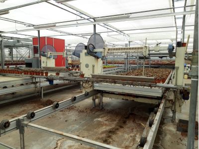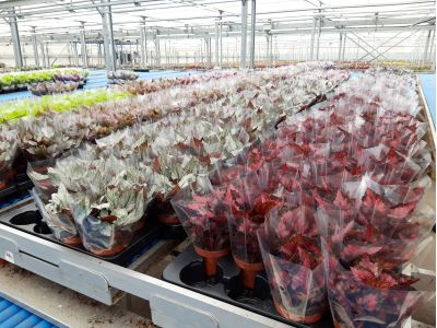 In the past, Berghoef also had more varieties in its range, but they decided to keep the range more limited, to drop the somewhat weaker varieties, so that they could better focus on the quality of the remaining varieties. The Koppe leaf cuttings are planted per 3 in a pot, so that the final plant becomes nicely full. This is still done by hand. As we could also see while we were there, it is difficult to automate this process; you have to make sure that the stem is put in the soil and it is still too difficult for a machine to recognize the stem. But it is being worked on, so who knows, there may be a machine that can do this work in the near future. They grow three different pot sizes; almost 95% of the plants are sold in pot size 12. The other 5% has pot size 9 or 17. From cutting to plant it takes 16 weeks when growing a plant with pot size 12, and it takes another 8 weeks, so total 24 weeks, for pot size 17. Over the years they have learned to grow a very nice compact plant because of the right mix of nutrition, temperature and light.