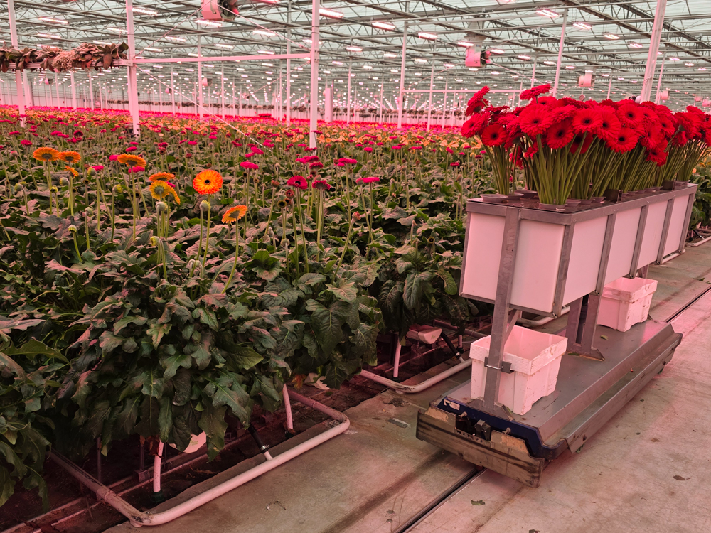 The tables that are due to be harvested are removed from the greenhouse by a robot. These tables are then transported into the shed, where the employees are ready to cut the lilies. On average it takes around a week to empty the greenhouse, depending on the variety and the season in which they grow.