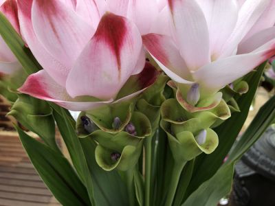 Het bijzondere van de Curcuma is dat niet de bloem zelf, maar het schutblad de sierwaarde van dit product bepaalt. Deze prachtige gekleurde bladeren functioneren als “huis” voor de echte bloemetjes, die aan de zijkanten groeien. Deze echte bloemetjes bloeien relatief gezien maar heel kort. Dit is goed terug te zien op de foto’s.