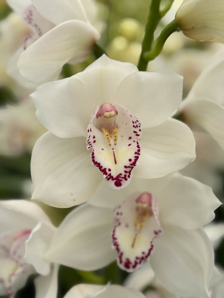 Frans streeft naar kwaliteit: stevige takken met veel bloemen. Zijn tip voor bloemisten: bij extreem zware takken kun je gerust de bovenste bloemen verwijderen. Dit zorgt voor meer stevigheid van de steel én geeft extra bloemen voor klein bloemwerk. Cymbidiums van Kwekerij Koningshof worden dagvers en rechtstreeks aan de handel geleverd, niet via de klok. Vers verwerkt zijn ze minimaal twee, vaak zelfs drie weken houdbaar – soms nog langer. Snijbloemenvoedsel is niet nodig, al kan het geen kwaad.