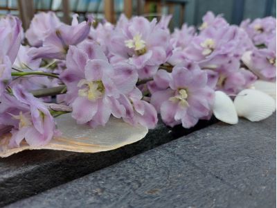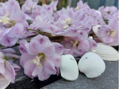 Marcel liet ons verschillende prachtige soorten zien op zijn tuin. Ons oog viel op de bijzonder mooi gekleurde Delphinium 'Dewi Flamingo’. Deze schoonheid heeft een mix van wit en roze tinten in de bloem. Hoe langer je ernaar kijkt, hoe mooier ze wordt.