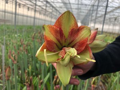Kwekerij van der Ende, gevestigd in Maasdijk, teelt al meer dan 25 jaar Amaryllissnijbloemen. Van september t/m juni bieden zij een uitgebreid assortiment Amaryllissen aan. Van der Ende is de op één na grootste Amaryllis kwekerij in Nederland, met het breedste assortiment. Met de ‘Cybister’ soorten proberen zij zich te onderscheiden. In de spotlight van deze week vinden wij de Hippeastrum Cybister ‘Tarantula’. Deze bijzondere bloem heeft dunne sierlijke bloembladeren die krullen. Het is een soort dat door de natuur gemaakt is en niet door veredeling gevonden is. Door veredeling zijn er op dit moment wel meer verschillende soorten. De Tarantula is geen nieuw soort en is al zeker 10 jaar op de markt. Het blijft een ontzettend gewild product, maar is helaas moeilijk om te telen. De bol geeft niet zoveel bloemen en is daarom niet erg productief. Toch blijft Van der Ende het product telen, om haar populariteit en de Tarantula is echt een meerwaarde voor zijn assortiment.