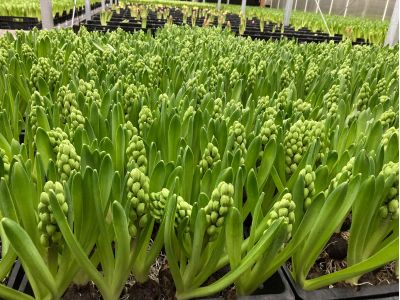 De bol begint te wortelen, de bloem begint haar groei vanuit de bol. Zodra de hyacinten lang genoeg zijn, worden ze naar de kas verplaatst (20-23 graden).