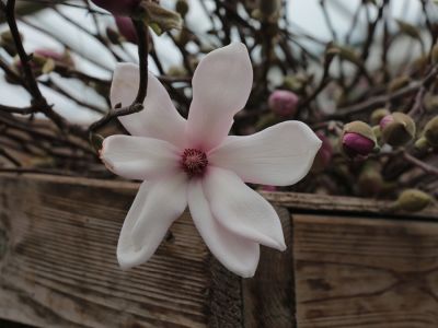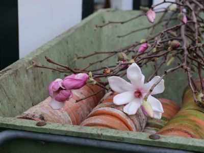 Grote, zware, grillige takken zijn een kunstwerk op zich als ze in een grote vaas of pot verwerkt zijn. In een grote ruimte is het een groot stoer object, maar door de bloem krijgt het daarbij ook een lieflijk en zacht tintje .