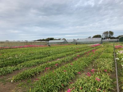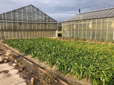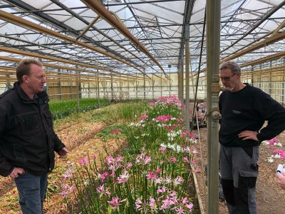 Bas en Ben namen ons mee naar hun ‘testbed’. Daar staan zo’n 100 soorten nerine, in zeer kleine aantallen. Uit dit bed selecteren de mannen de beste soorten. Daarbij kijken ze naar lengte van de steel. Hoeveel bloemen geeft een tak? Zijn het dikke stelen, rechte stelen of kromme stelen? Ook het bloeipercentage en de “presentatie”. Een bloem mag niet openspringen in de knop. Dit is niet gunstig voor de export.