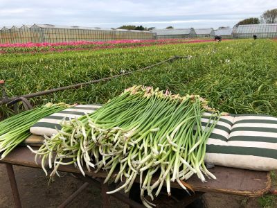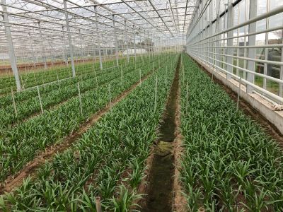 Bas en Ben telen zowel de Elegance lijn, die vooral buiten geteeld wordt, als de Bowdenii lijn, die juist binnen geteeld wordt. Het grote verschil is vooral de lengte. De Elegance wordt niet langer dan 50-60 cm omdat deze buiten geteeld wordt. De Bowdenii lijn daarentegen kan wel zo’n 80cm worden. Het groeien van de bol zelf gebeurt altijd buiten.