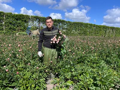 De oogst begint rond half april in de tunnelkassen, afhankelijk van het weer. Jeroen snijdt pioenen op het moment dat ze kleur tonen, maar nog niet te rauw zijn. Na de oogst blijven drie stelen per plant staan. Alleen de koppen worden verwijderd, zodat de energie terug de plant in kan. In het najaar wordt het gewas gemaaid. In het voorjaar bloeien ze weer volop.