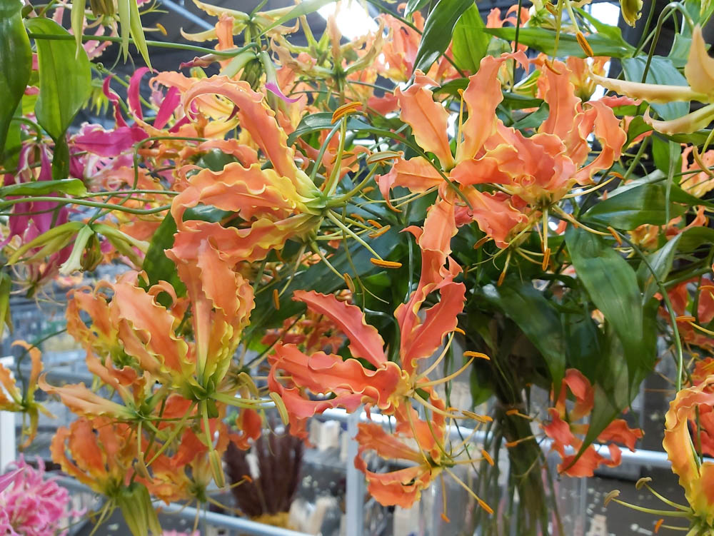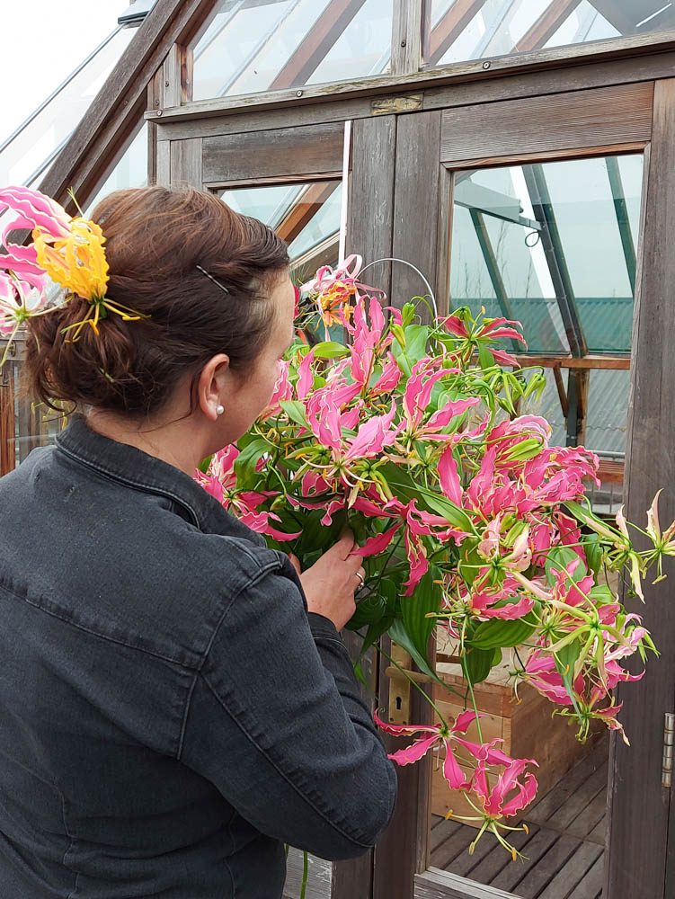 Gloriosa is een prachtig, maar kwetsbaar product. Het hele teeltproces gebeurd handmatig en dat maakt deze teelt enorm arbeidsintensief. Gloriosa is een klimplant en groeit op de kwekerij in gaas. Elke week worden de pluizen verwijderd en de aangegroeide takken naar de juiste kant van het gaas begeleid, zodat ze niet helemaal in elkaar vergroeien.