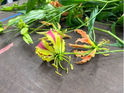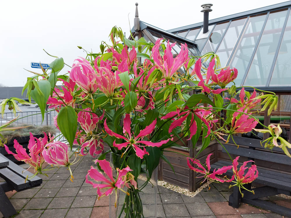 We waren aangenaam verrast over de houdbaarheid van de Gloriosa. Op het oog lijkt het een hele kwetsbare tere bloem. Maar nadat de bloemen de hele week op de Trade Fair hadden gestaan, hebben ze zeker nog een dag of tien op het FloraPodium mogen stralen. Antoine geeft aan dat de korte monobloemen een dag of tien op de vaas staan, de lange tak twaalf tot veertien dagen. Het afrijpingsproces van de bloem is hetzelfde, zowel op de korte als de lange tak. De korte takken hebben echter maar één bloem en de lange meerdere, dus als de onderste bloem is uitgebloeid komen de andere nog open en heb je er langer plezier van.