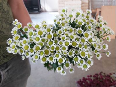 Deze spin vormige bloem zou een prima vervanger voor een Matrecaria kunnen zijn in een boeket. Matricaria wordt zeer veel gebruikt in boeketten. Kerio white heeft een vergelijkebare uitstraling maar met een zeer sterke houdbaarheid, uniformer en stevige stelen om mee te werken.