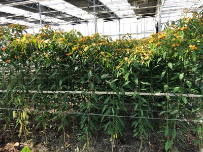 Aad and Gerard grow six different types of Euphorbia Fulgens on about 2 ha of land. Orange, red, yellow and salmon in autumn. Red and white in winter. Most species are available from September to December. But because the brothers use assimilation lighting in the winter time, they can continue to grow until February while keeping the quality up to standard.