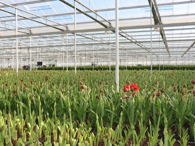 The Amaryllis bulbs are put on large beds with a tempex insulating layer containing clay granules as a cultivation substrate. The first flowers of the season will be cut in September. The peak lasts about five to six weeks, starting November 10 until Christmas.