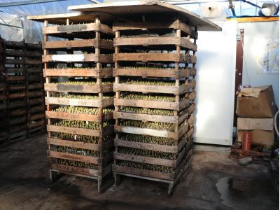 The Muscari bulbs are planted between October and mid-December. They are hand-picked and put in boxes. The Muscari naturally blooms in April, because the bulb needs a cold period (just like most bulb varieties) before it starts flowering. In order to be able to regulate the flowering period, the crates are placed in cold storage for 16 weeks. Every day Koen takes out a few boxes and places them in the greenhouse. Because the crop grows in the dark while in cold storage, the young plants first have yellow leaves when taken out. They become greener in the greenhouse every day. The first flowers can be cut after two to three weeks.