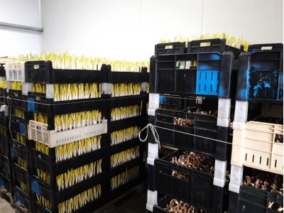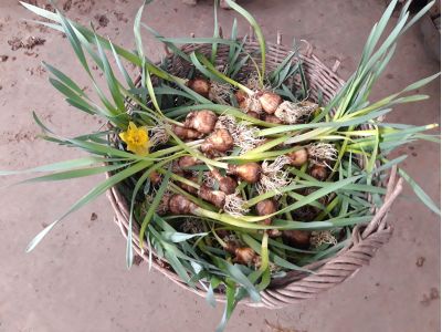 Hans grows five different types of daffodils: 'Martinette', 'Bridal Crown', 'Geranium', 'Dick Wilden' and 'Standard Value'. In addition, he grows several seasonal products such as tulips, clarkias, montbretias and chrysanthemums. Because Hans only grows on 300 m2 of daffodils, he tries to make a difference in growing small and unique varieties. This allows him to compete against the bigger nurseries. Breeding is not done by Hans himself; he purchases his bulbs from other growers.