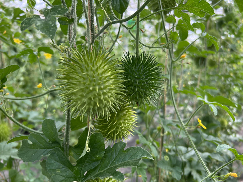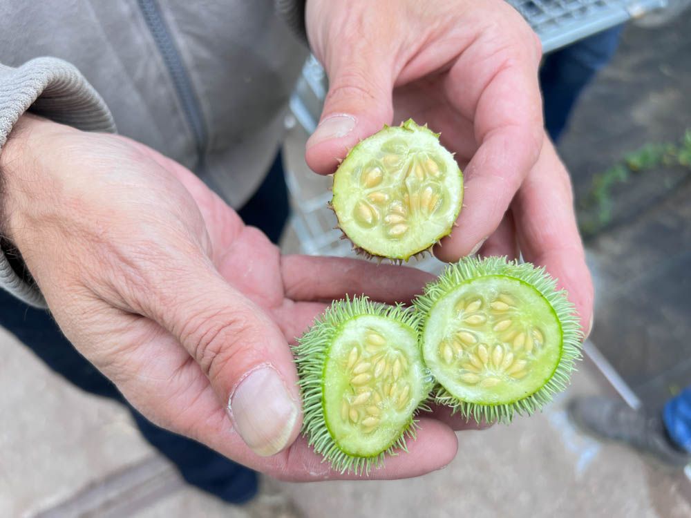 Diplocyclos requires extra manual work: every vine is guided by hand, leaves are individually trimmed with small scissors, and tendrils are carefully untangled. At harvest time, whole vines are cut, fruits included.