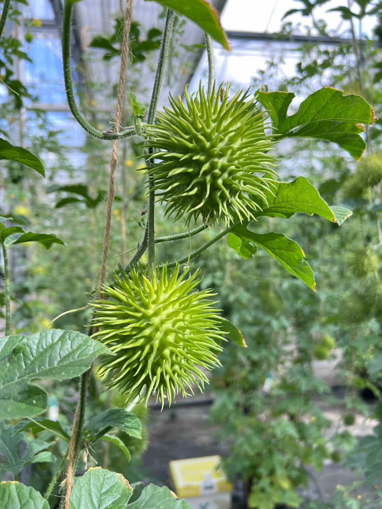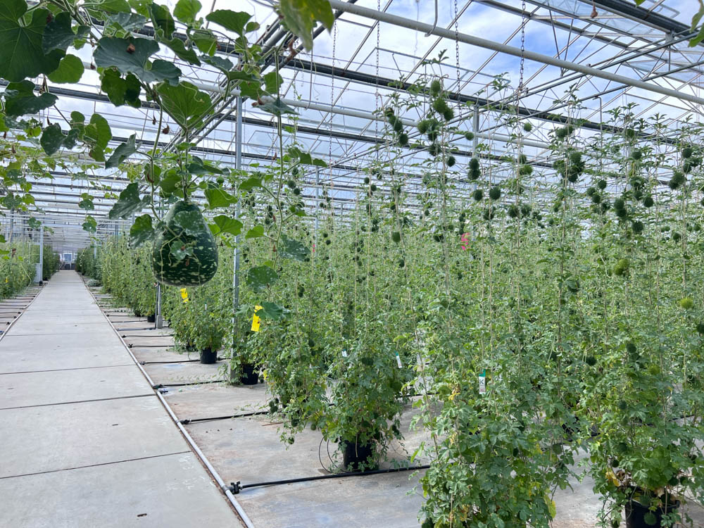 Cultivation takes place entirely in the greenhouse. All plants are trained upwards along strings so the fruits can hang freely and develop without damage. Both the fruit-bearing crops and the climbing types such as diplocyclos are carefully tied.