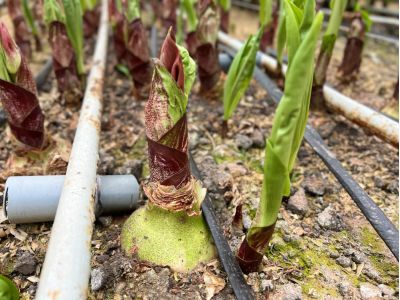The leaf remains on the plant for as long as possible because the bulb draws energy from it to grow. About three months before the new bloom, the leaf is removed so that all energy goes to the flower. After four seasons, the bulbs are harvested, the roots removed, and the soil steamed. The bulbs are then cooked and prepared to be replanted.