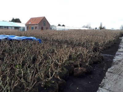 When the greenhouse is empty, the shrubs are pruned and are moved outside again. When the production season is over (early May), the shrubs are planted back onto the fields and skip a production year. However, they are pruned after the first year. These branches can be used to graft on rootstocks.