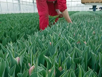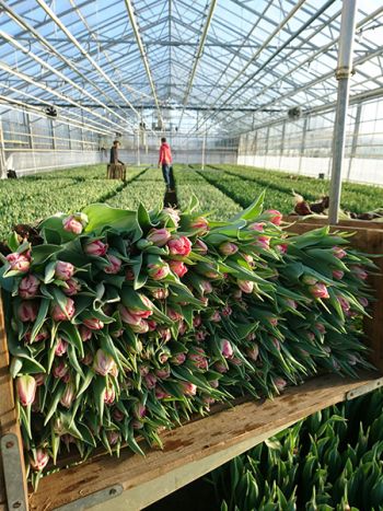 After the tulips have been harvested, the bulb is removed, the tulips are bundled and packed to go to the auction.