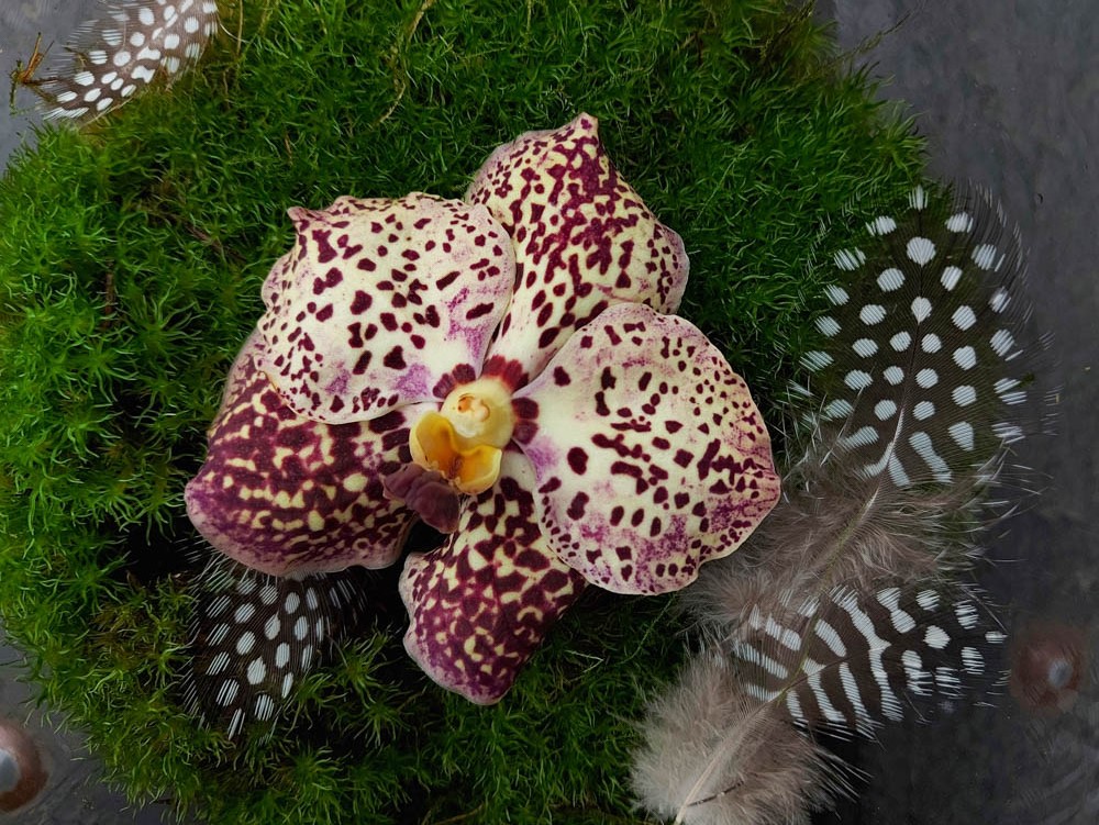 Vandas originate from the rugged southern slopes of the Himalayas, from India to southern China. There the Vanda grows high in the trees, with aerial roots that attach themselves to the trees. Vandas grow almost invisibly as an epiphyte high in the tree. The plant lives on morning dew and raindrops. In order to attract insects for pollination in an inhospitable place like this, the Vanda has to stand out, and it does so because of its special colours.