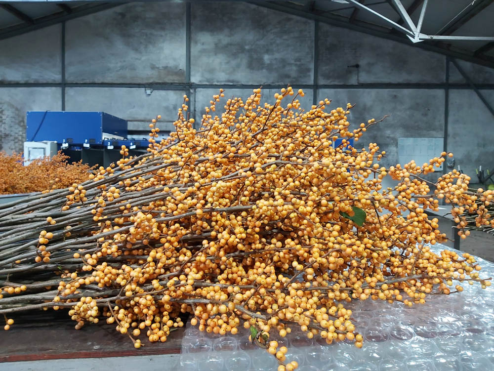 Ilex is sold with no leaves on the branches. After all, the ornamental value lies with the berry. The moisture evaporates quickly from the leaf, after which the leaf draws moisture from the berry. This is at the expense of the shelf life of the product. The leaves are removed by scalding. The branches are placed on tables covered with black plastic and bubble wrap, creating a very warm and humid environment. After ten days the leaves fall off and the product can be processed.
