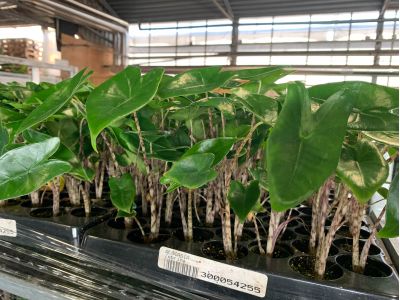The Alocasia species arrive as a cutting at Vireõ. These are immediately repotted in the end pot. They are placed on rolling tables where they stand for 10 to 11 weeks. In this phase, the plant mainly invests a lot of energy in the production of the roots.