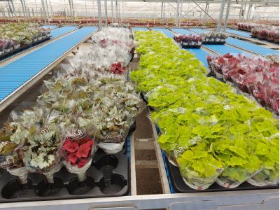 In the past, Berghoef also had more varieties in its range, but they decided to keep the range more limited, to drop the somewhat weaker varieties, so that they could better focus on the quality of the remaining varieties. The Koppe leaf cuttings are planted per 3 in a pot, so that the final plant becomes nicely full. This is still done by hand. As we could also see while we were there, it is difficult to automate this process; you have to make sure that the stem is put in the soil and it is still too difficult for a machine to recognize the stem. But it is being worked on, so who knows, there may be a machine that can do this work in the near future. They grow three different pot sizes; almost 95% of the plants are sold in pot size 12. The other 5% has pot size 9 or 17. From cutting to plant it takes 16 weeks when growing a plant with pot size 12, and it takes another 8 weeks, so total 24 weeks, for pot size 17. Over the years they have learned to grow a very nice compact plant because of the right mix of nutrition, temperature and light.