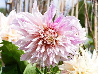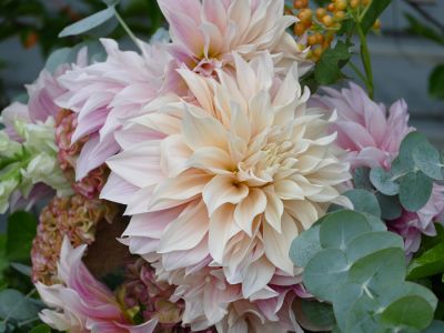 Dahlia ‘Café au Lait’ is een soort dat behoort in het luxe segment. De grootte van dit bijzondere soort is adembenemend. Het is een decoratief bloemige dahlia met brede lintbloemen met een abrikoos tot beige tint. . Hier komt ook de naam ‘Koffie met melk’ vandaan. Net als pompon of waterlelie is decoratief een bloeitype. Onze partner Regine Motmans van het bedrijf Florigineel vergezelde ons tijdens het bezoek bij H&BR van den Bosch. Wij vroegen haar: “Waarom werk je als bloemstyliste zo graag met deze dahlia?” Haar antwoord was vrij kort, maar heel duidelijk: “Omdat de vorm en kleur echt onderscheidend is!”