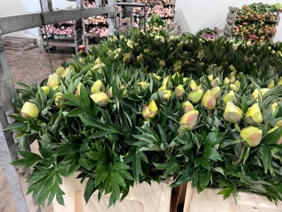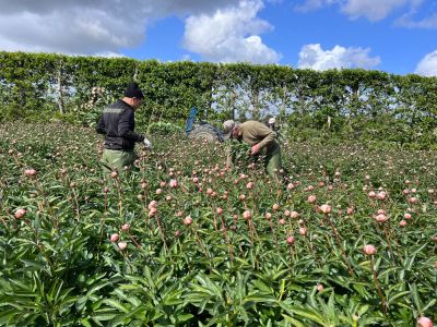 De oogst begint rond half april in de tunnelkassen, afhankelijk van het weer. Jeroen snijdt pioenen op het moment dat ze kleur tonen, maar nog niet te rauw zijn. Na de oogst blijven drie stelen per plant staan. Alleen de koppen worden verwijderd, zodat de energie terug de plant in kan. In het najaar wordt het gewas gemaaid. In het voorjaar bloeien ze weer volop.