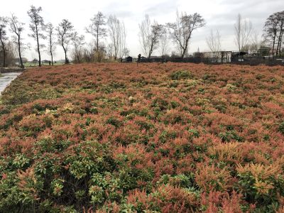 Op deze velden staan verschillende soorten pierissen, ieder met een eigen kleur. Zo telen zij ‘Cupido’, ‘Purity’, ‘Select’, ‘Valley Valentine (Red)’, ‘Valley Rose (Pink)’ en ‘Prelude’. Deze soorten zijn stuk voor stuk mooie producten met een lange houdbaarheid op de vaas. In de herfst en winter worden de takken aangevoerd in de knop, dan hebben ze een houdbaarheid van minimaal drie weken. Deze knoppen zelf zijn van sierwaarde en komen niet meer open op de vaas. In het voorjaar, als de pieris in bloei wordt aangeleverd, hebben ze een houdbaarheid van ca. 2 weken. Wanneer deze soorten worden gebruikt in buitenpresentaties zoals bijvoorbeeld rouwwerk, is de houdbaarheid vaak nog langer, omdat het over het algemeen buiten wat kouder is. Veredelen doet het bedrijf niet zelf. Er worden nieuwe soorten gekweekt door andere plantenkwekers en veredelaars. Ook wordt de pieris gestekt door gespecialiseerde bedrijven.