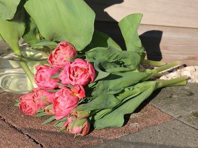 Tulpen worden meestal droog aangeleverd, waardoor ze een tijd geen water hebben gehad. Door ze eerst een uur in papier of folie in water te zetten, kunnen de stelen goed water opnemen zodat ze weer stevig zijn.