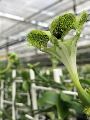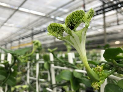 Ceropegia wordt in de volksmond ook wel lantaarnplantje genoemd. Er bestaan wel 200 verschillende Ceropegia soorten. De meeste bekende is de Ceropegia woodii, het hangende lantaarnplantje. Tijdens ons bezoek aan kwekerij Hoogendoorn Stephanotis viel ons oog op een Ceropegia soort met een bloem dat de naam ‘lantaarnplantje’ eer aan doet. De Ceropegia sandersonii wordt ook wel Africaanse Parachuteplant genoemd. Hans vertelde ons alles over deze excentrieke, trendy plant en de uitdaging om dit plantje meer bekendheid te geven.