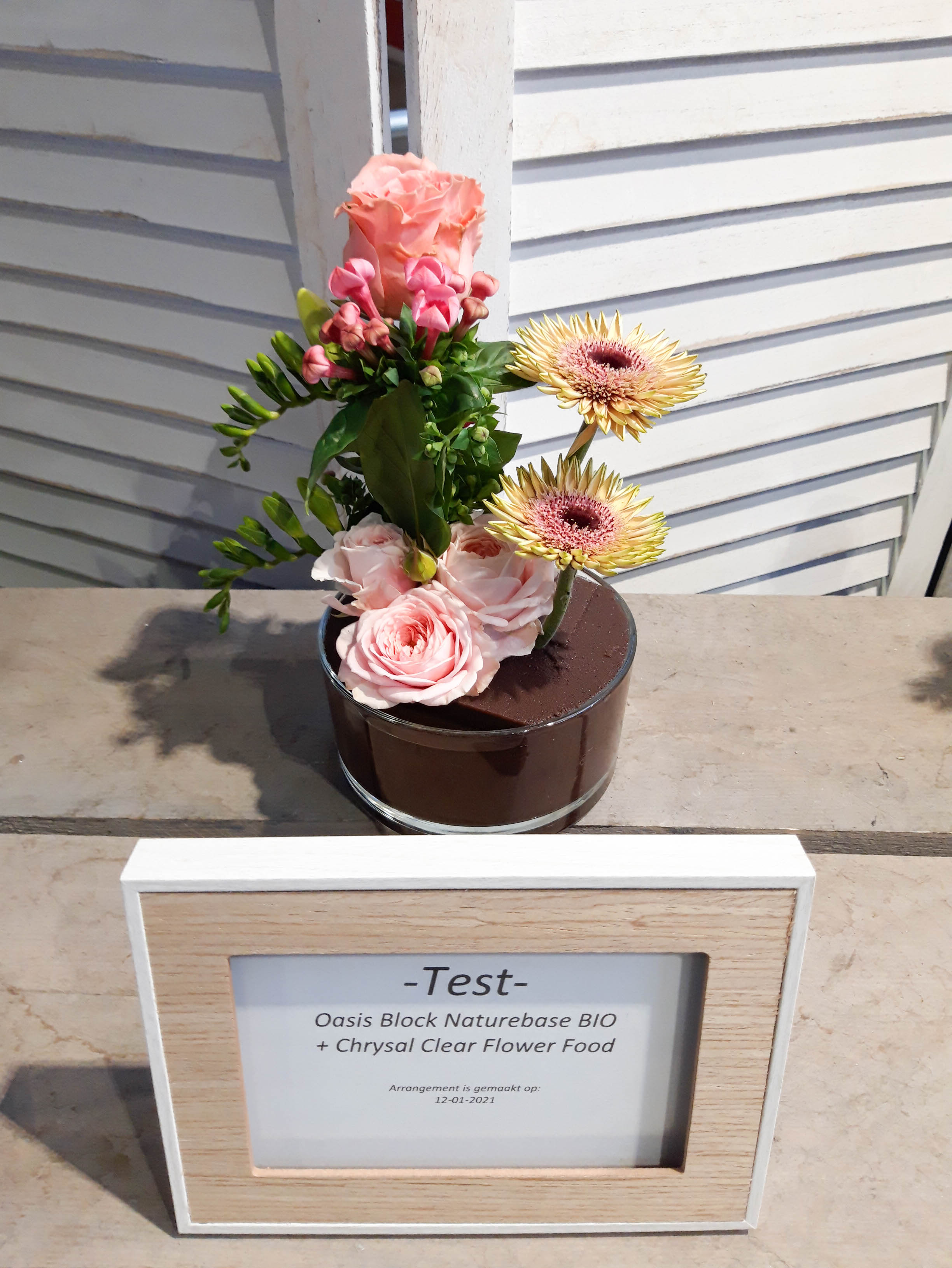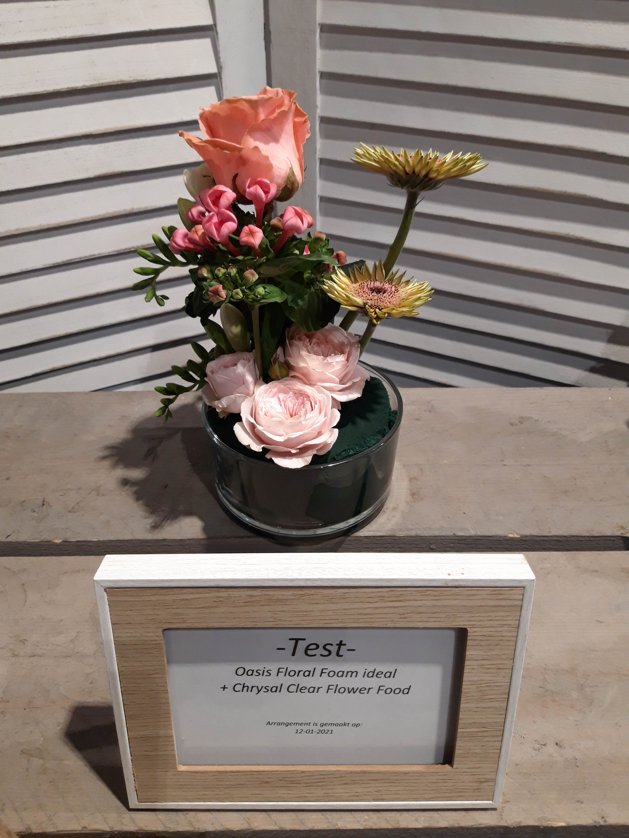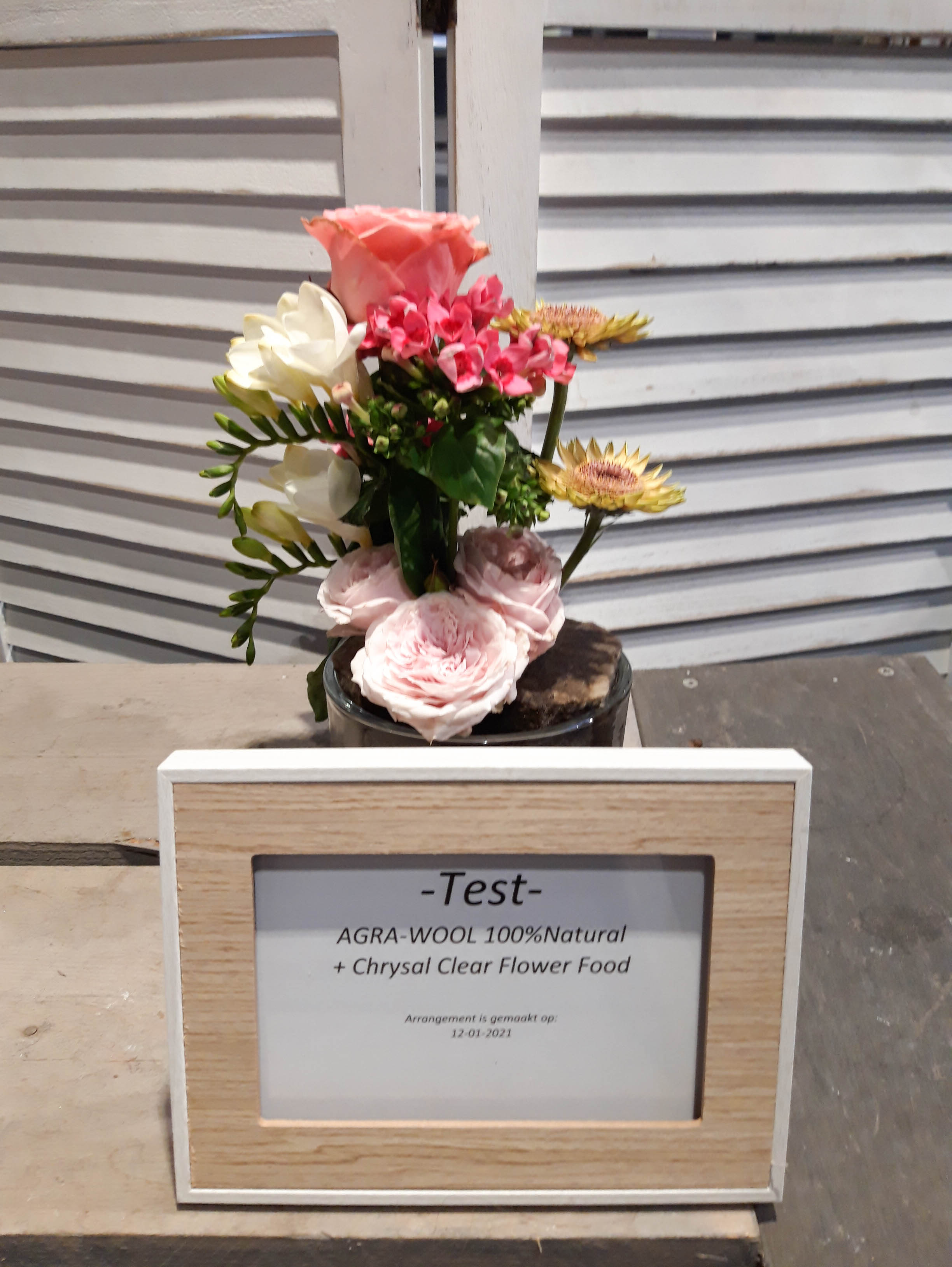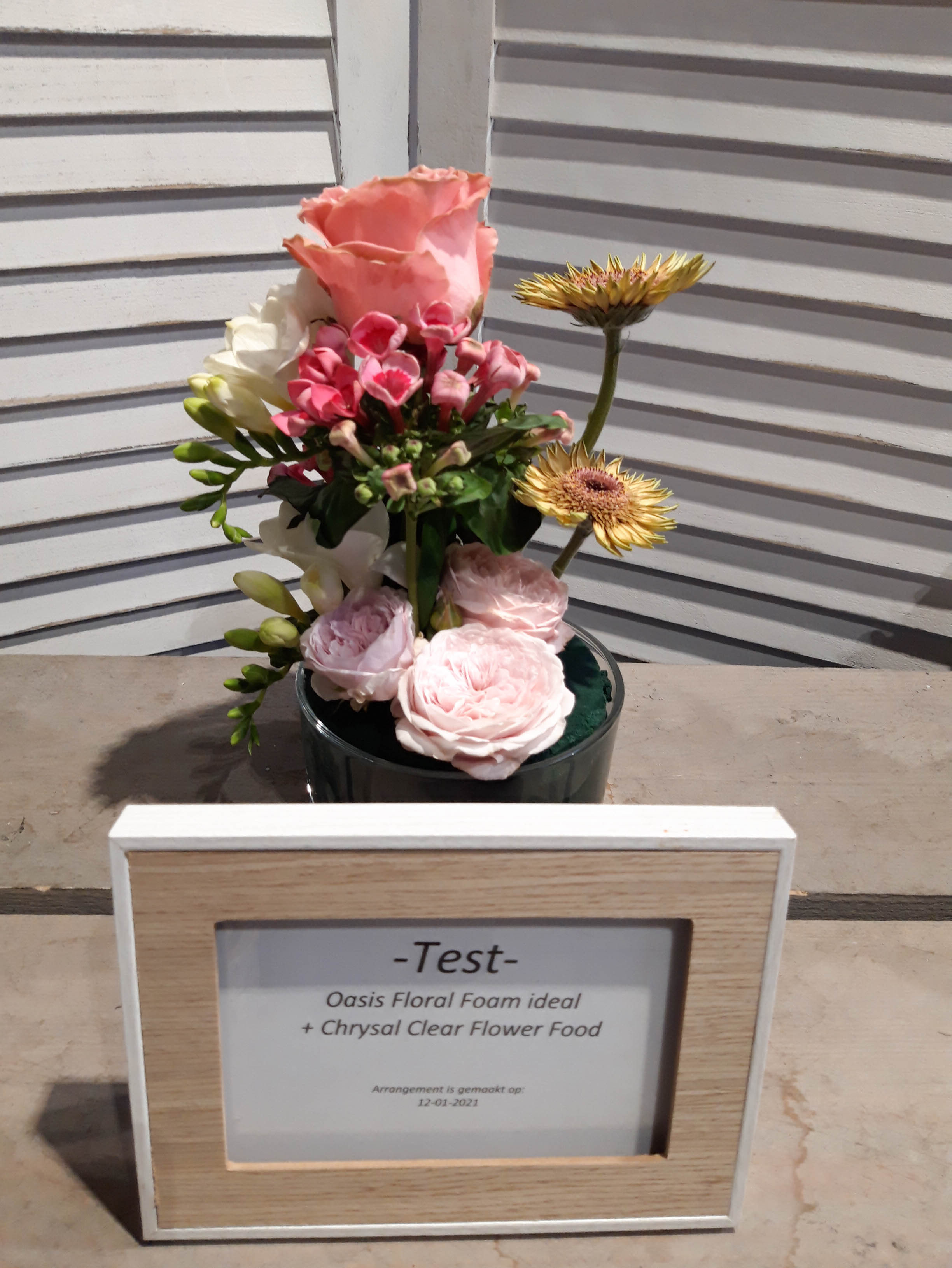 Op het FloraPodium hebben we vier kleine bloemstukjes gemaakt. Er zijn verschillende soorten steekschuim gebruikt om te vergelijken. We hebben foto’s van de arrangementen gemaakt op 12 januari, 14 januari en 18 januari. Qua houdbaarheid van de bloemen doen de 100% Natural Floral Foam blokken absoluut niet onder voor andere soorten steekblokken. We moesten wel regelmatiger water bijvullen, is dit een teken dat de bloemen meer water opnemen? Daar durven we na één test geen antwoord op te geven. Het steken in de blokken is even wennen, het is iets stugger dan de gewone blokken steekschuim. Maar als je even voor prikt (met name voor de dunne stelen), kun je daarna gemakkelijk de stelen verwerken. Bij een van de arrangementen hebben we The Solution snijbloemenvoedsel gebruikt, bij de andere arrangementen Chrysal Clear. Hierin zagen we weinig verschil. We hebben voor nu nog te weinig informatie om hier dieper over op in te gaan.