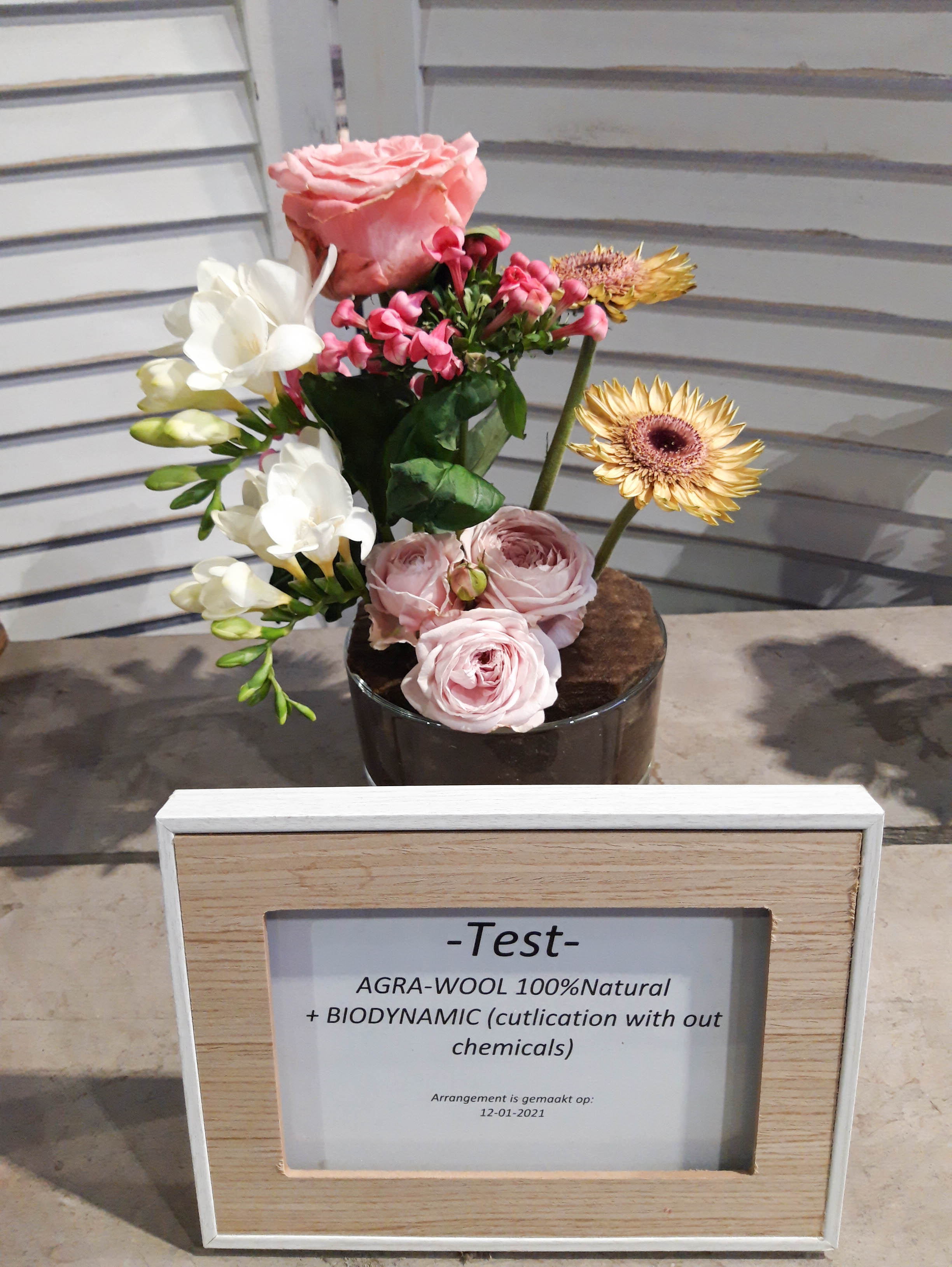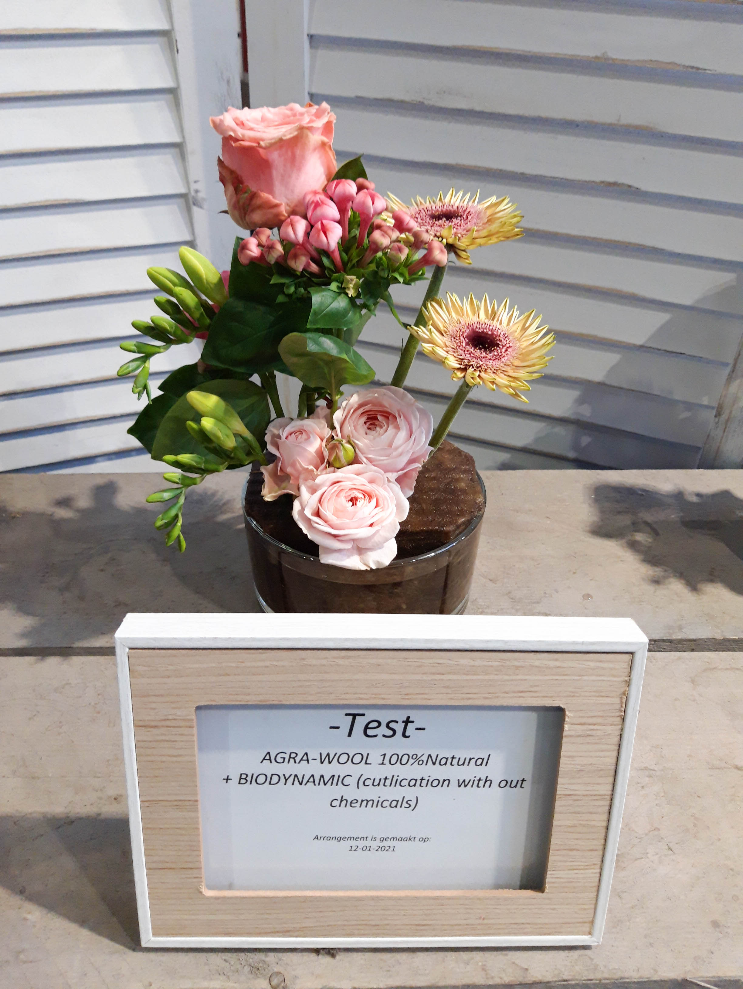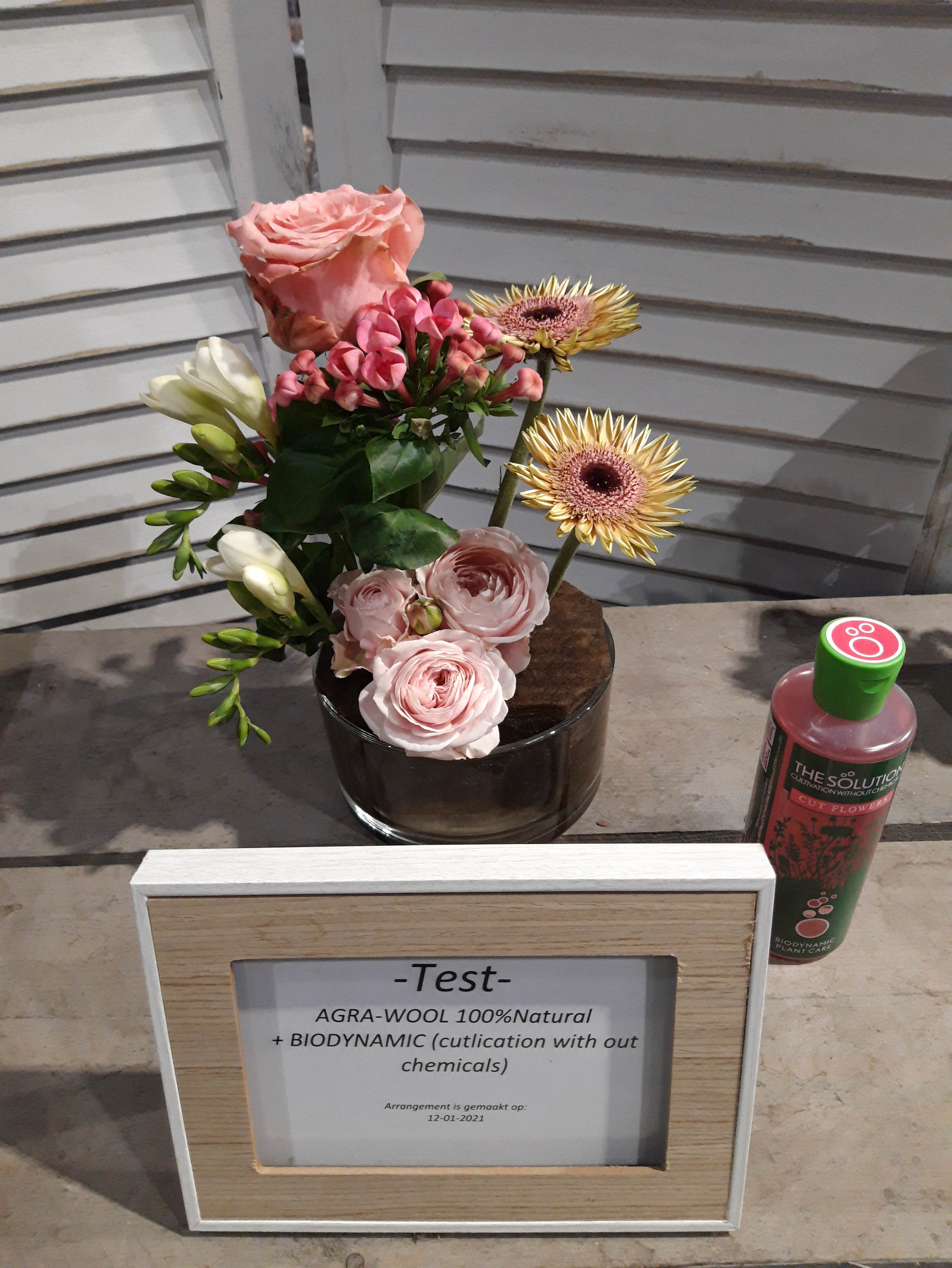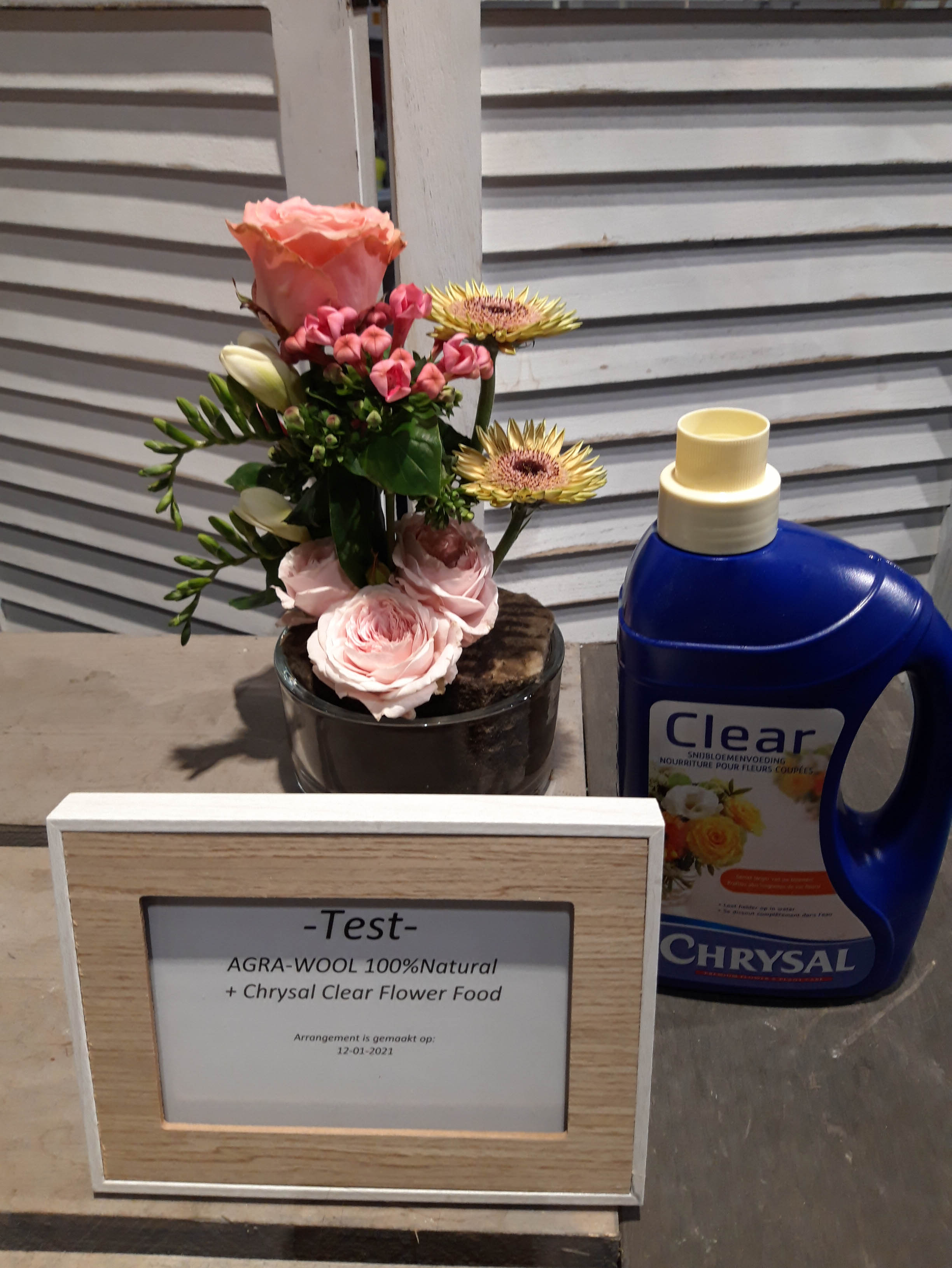 Op het FloraPodium hebben we vier kleine bloemstukjes gemaakt. Er zijn verschillende soorten steekschuim gebruikt om te vergelijken. We hebben foto’s van de arrangementen gemaakt op 12 januari, 14 januari en 18 januari. Qua houdbaarheid van de bloemen doen de 100% Natural Floral Foam blokken absoluut niet onder voor andere soorten steekblokken. We moesten wel regelmatiger water bijvullen, is dit een teken dat de bloemen meer water opnemen? Daar durven we na één test geen antwoord op te geven. Het steken in de blokken is even wennen, het is iets stugger dan de gewone blokken steekschuim. Maar als je even voor prikt (met name voor de dunne stelen), kun je daarna gemakkelijk de stelen verwerken. Bij een van de arrangementen hebben we The Solution snijbloemenvoedsel gebruikt, bij de andere arrangementen Chrysal Clear. Hierin zagen we weinig verschil. We hebben voor nu nog te weinig informatie om hier dieper over op in te gaan.